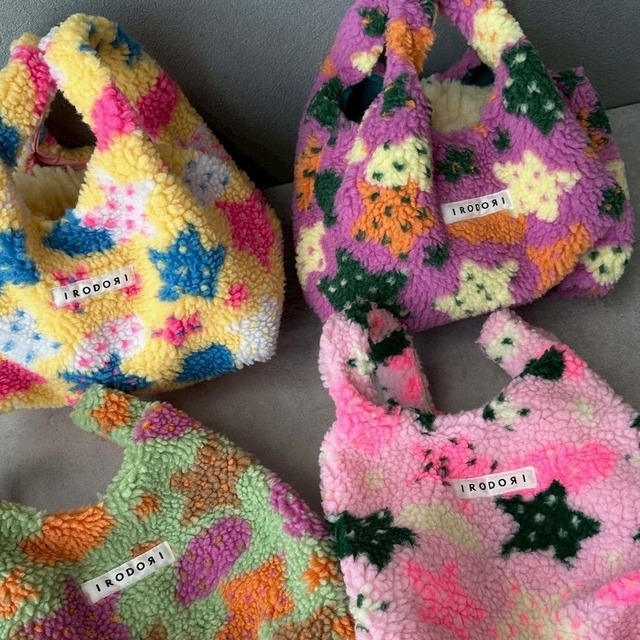 カラフルな星柄のボアミニバッグ。 4色展開でどの色も差し色カラーでかわいい。 ※裁断場所によって柄の見え方が異なります。 【 サイズ 】 横 22cm × 幅 14cm × 高さ 16cm
