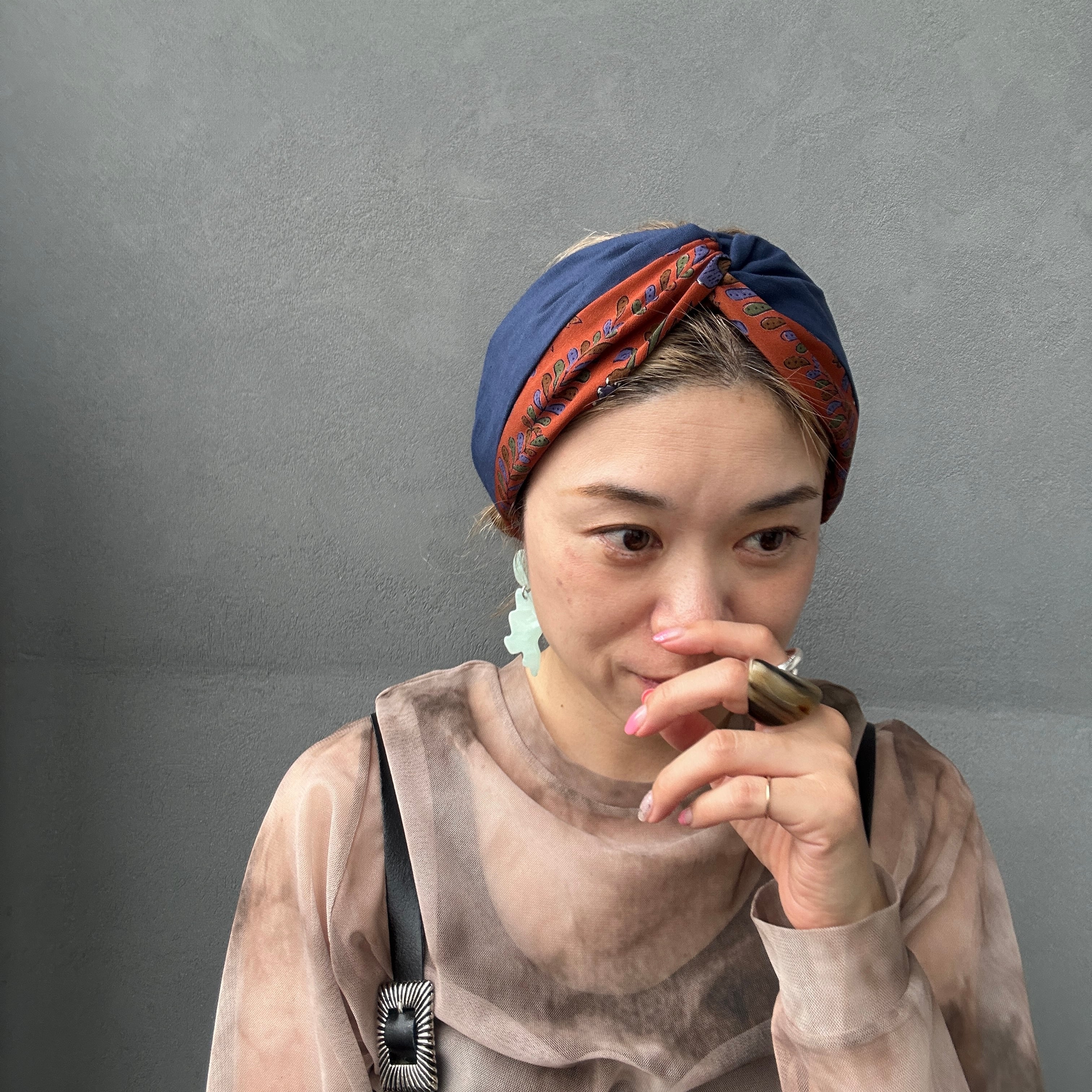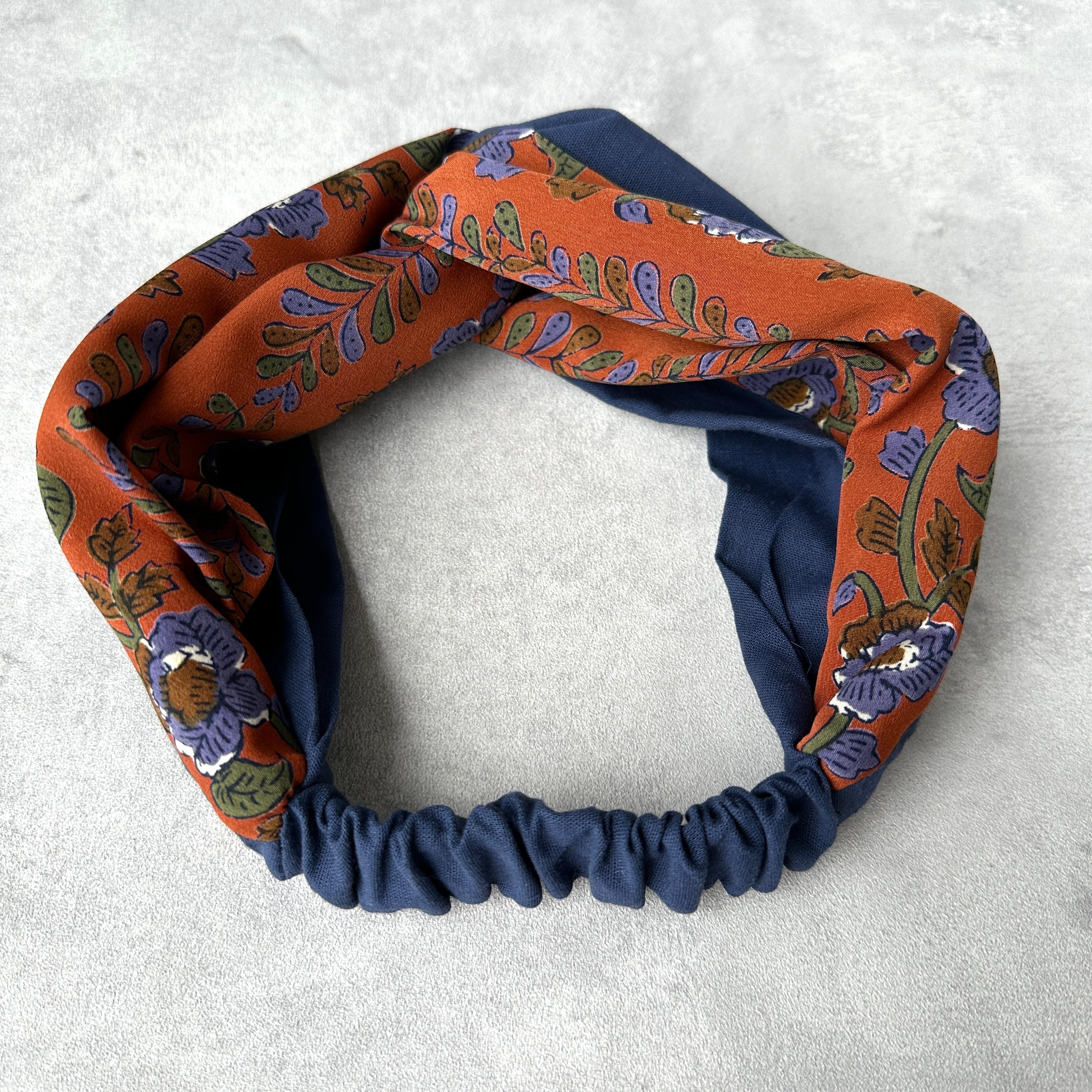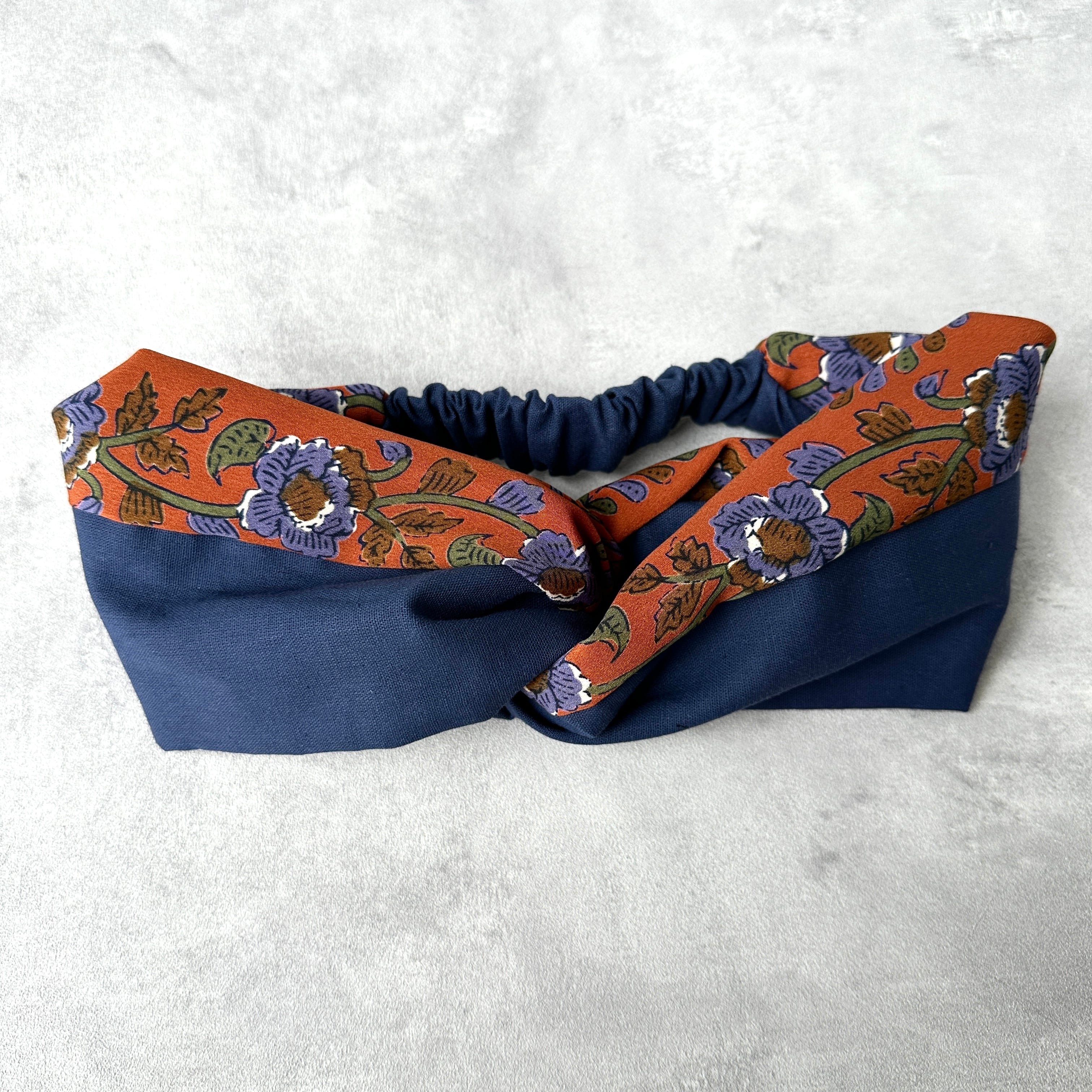 ブラウンオレンジの花柄とネイビーの生地を組み合わせた大人レトロなターバン。