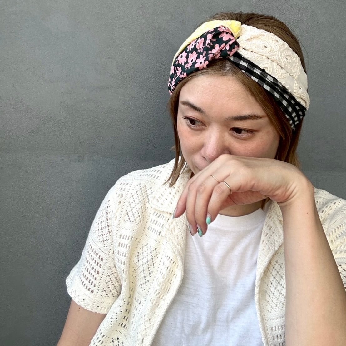 2種類のチェック生地に花柄とレース生地を合わせた華やかなターバン。
