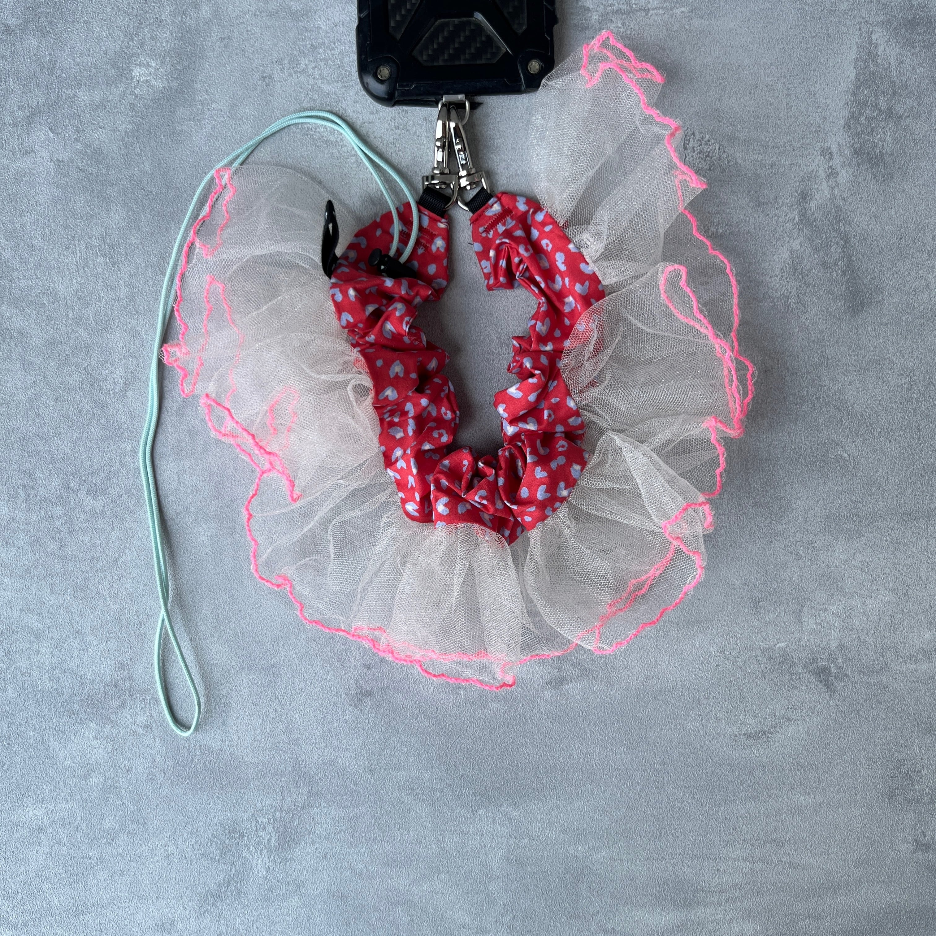 ハートのヒョウ柄に大きなレースを組み合わせたストラップです。