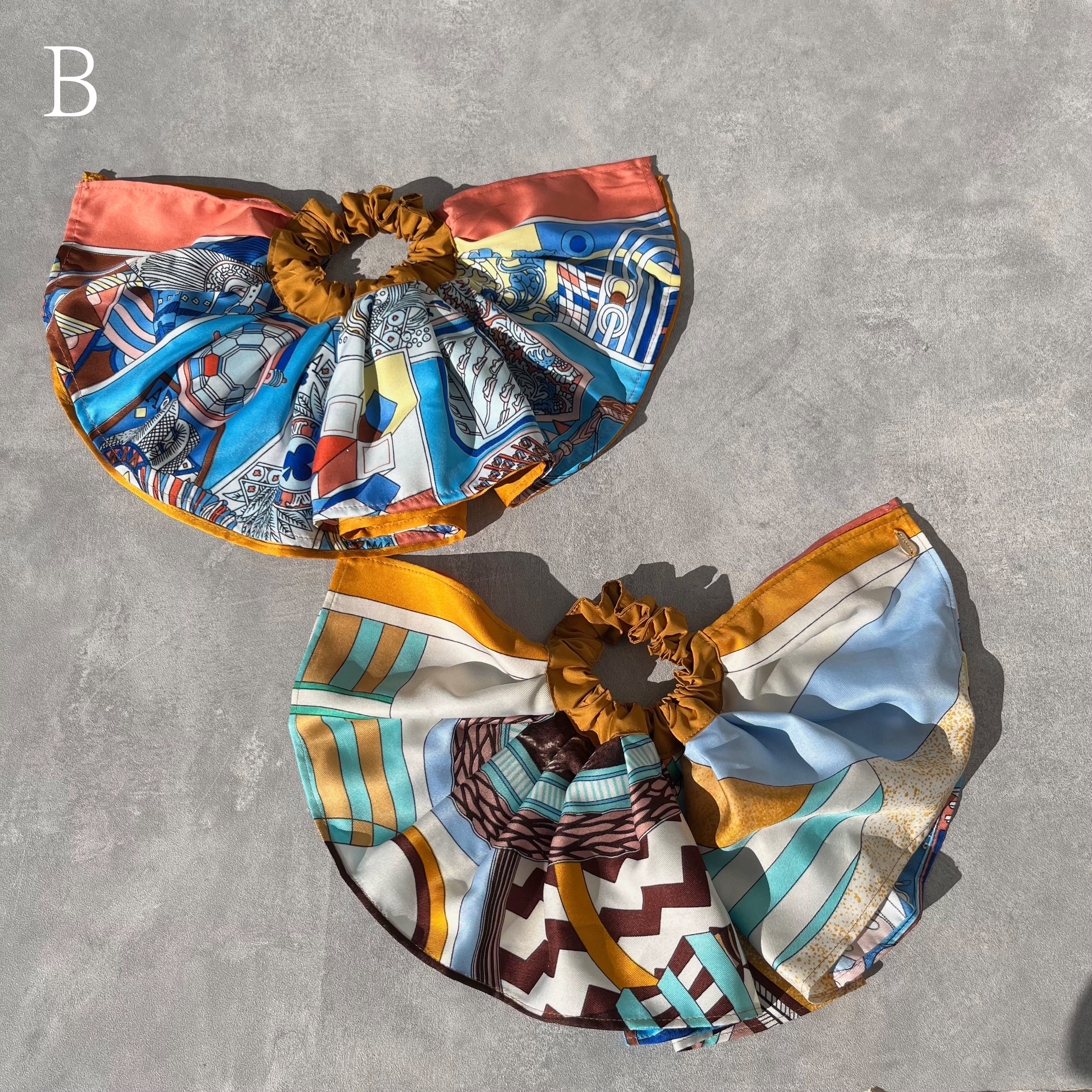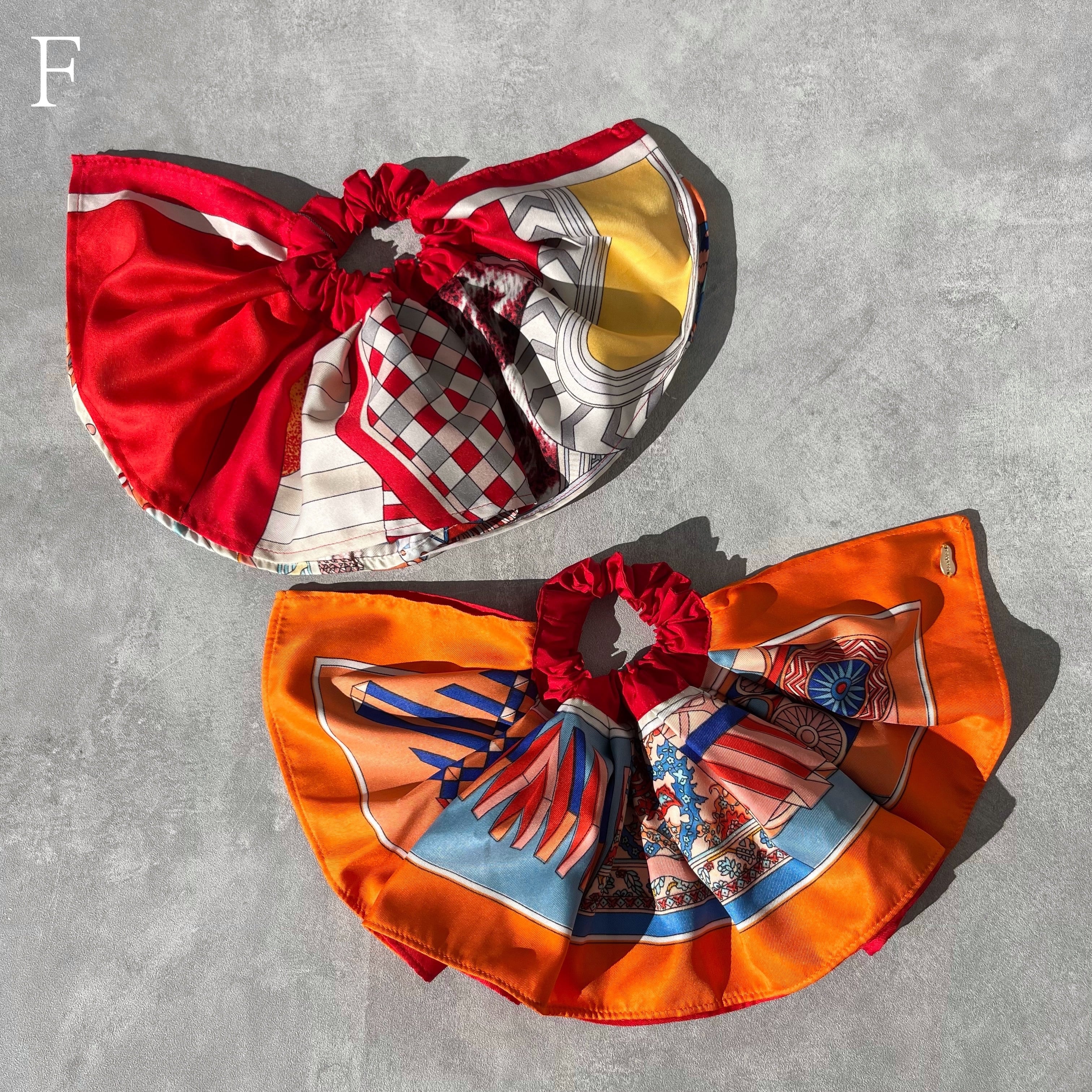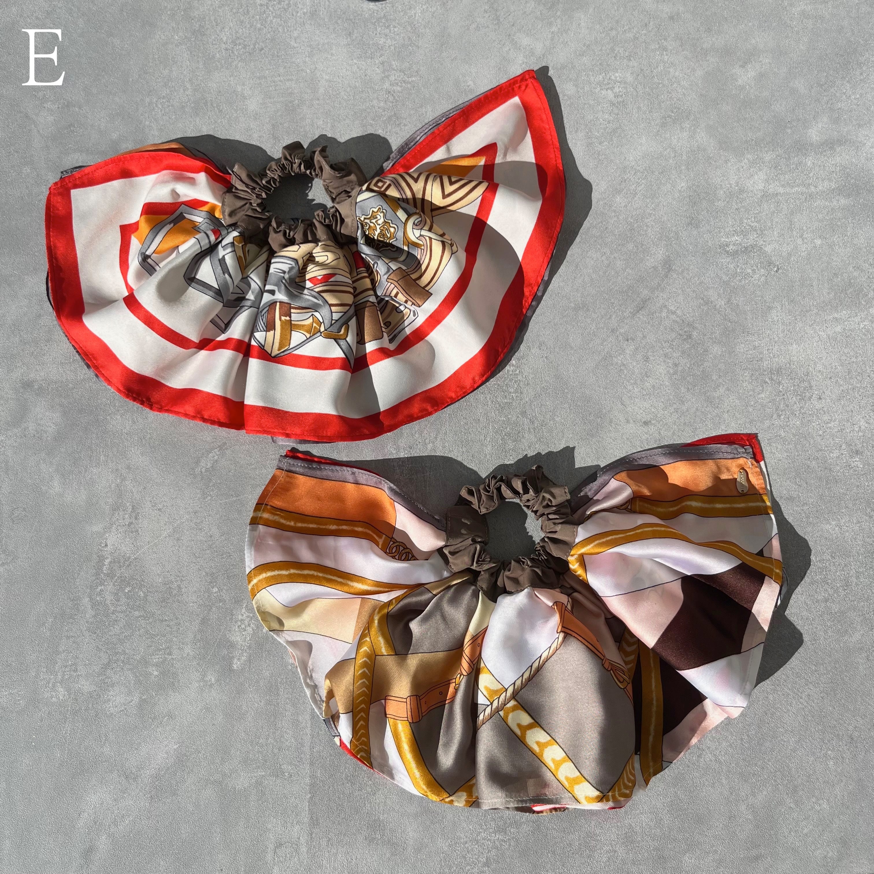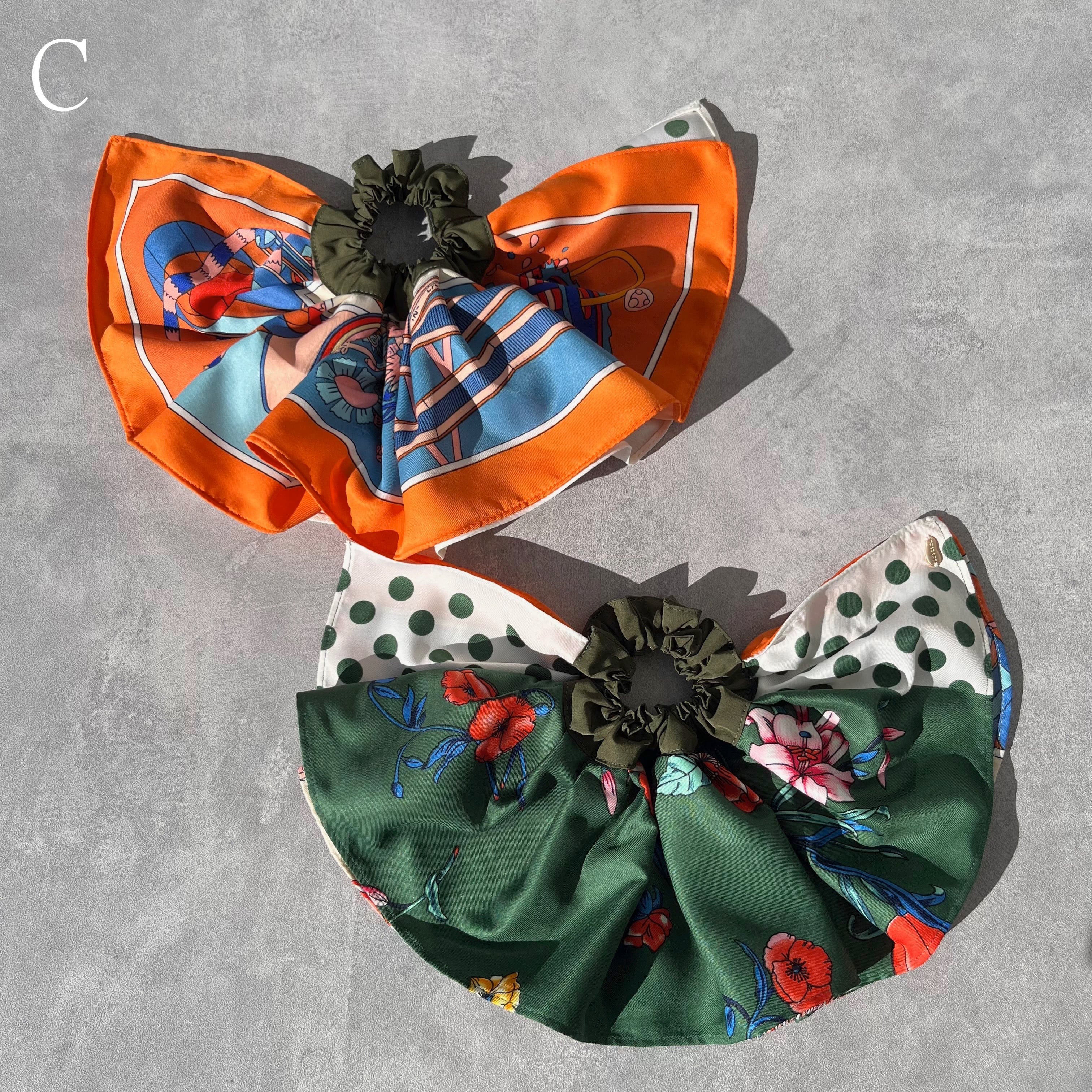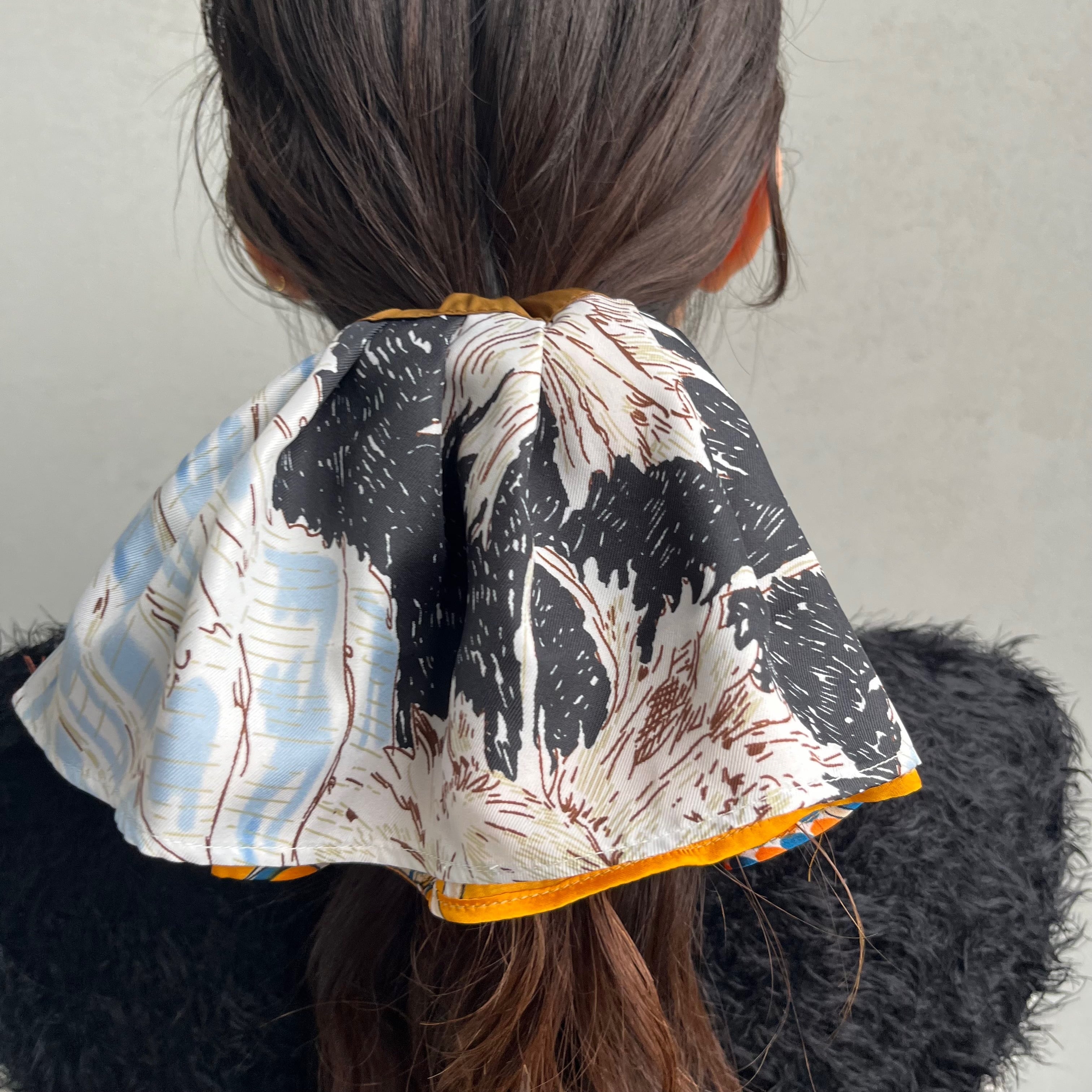 スカーフ2種類を組み合わせたボリューミーなシュシュ。