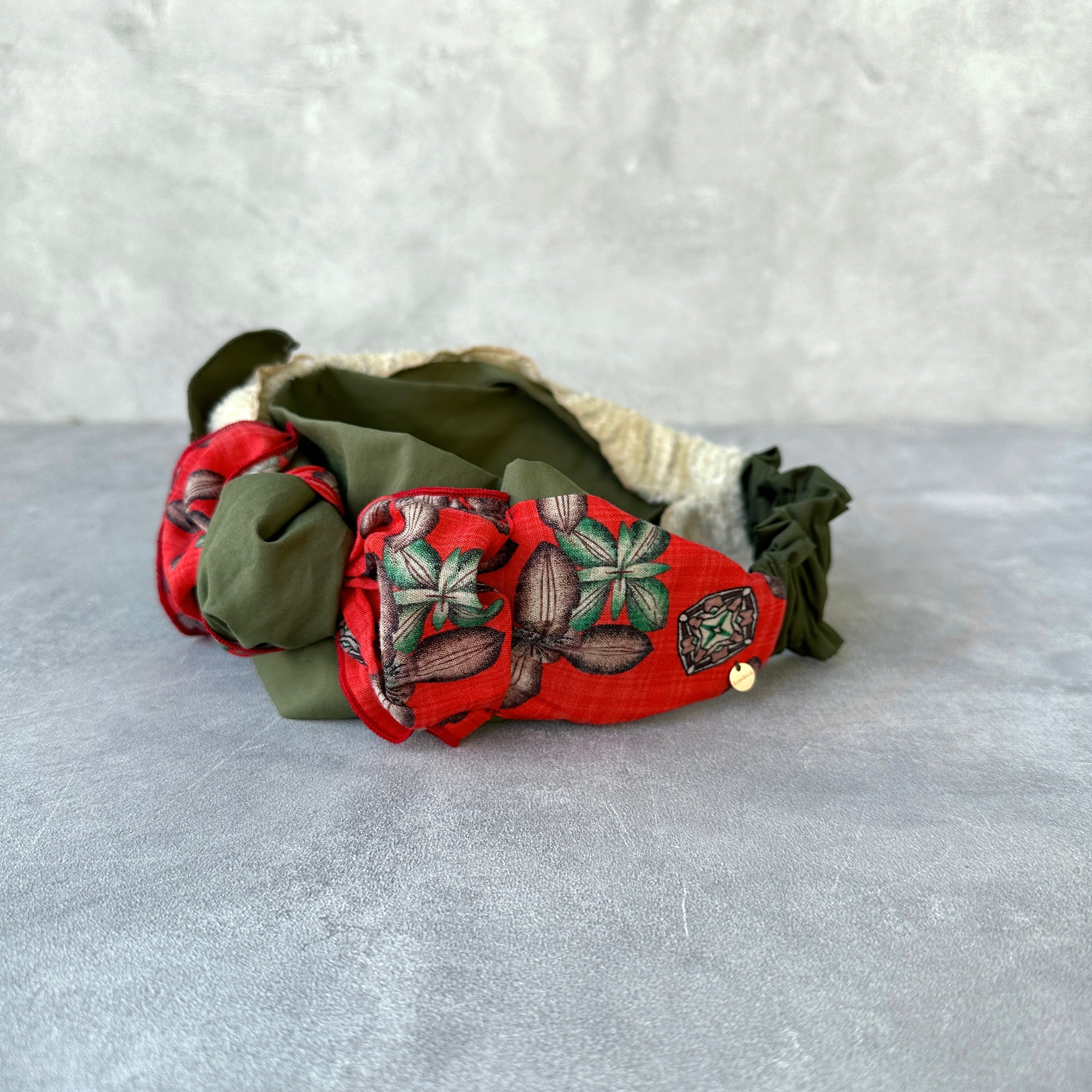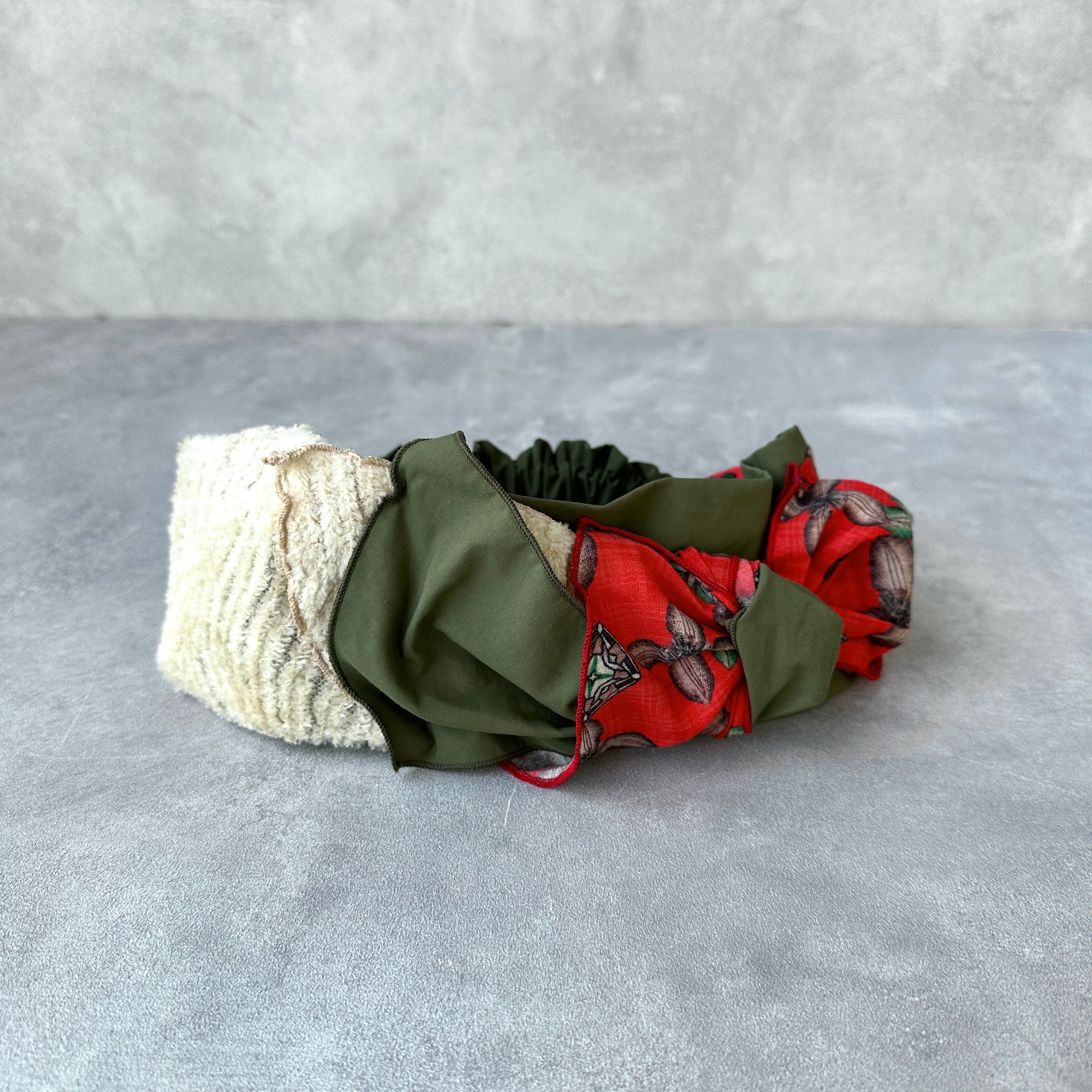 深みのあるグリーンに、印象的なレッドの柄生地を重ねたターバン。