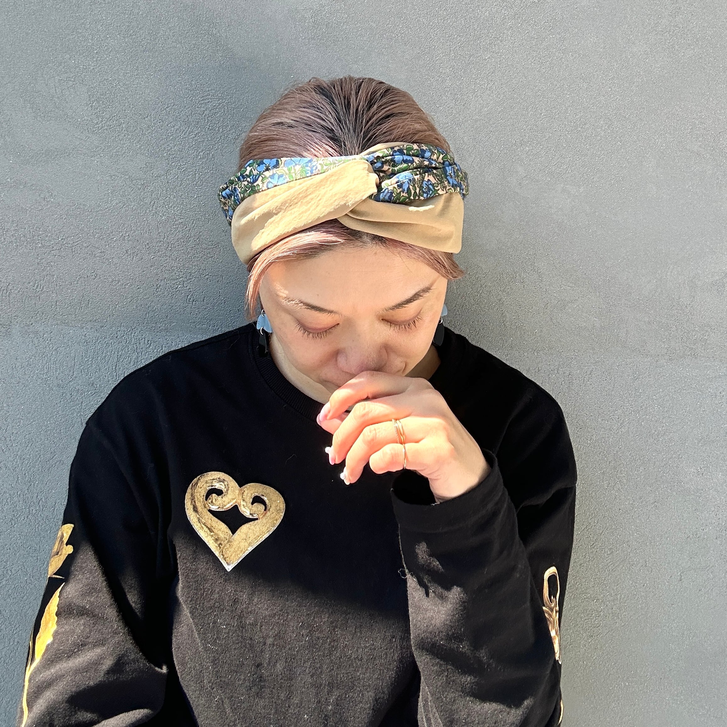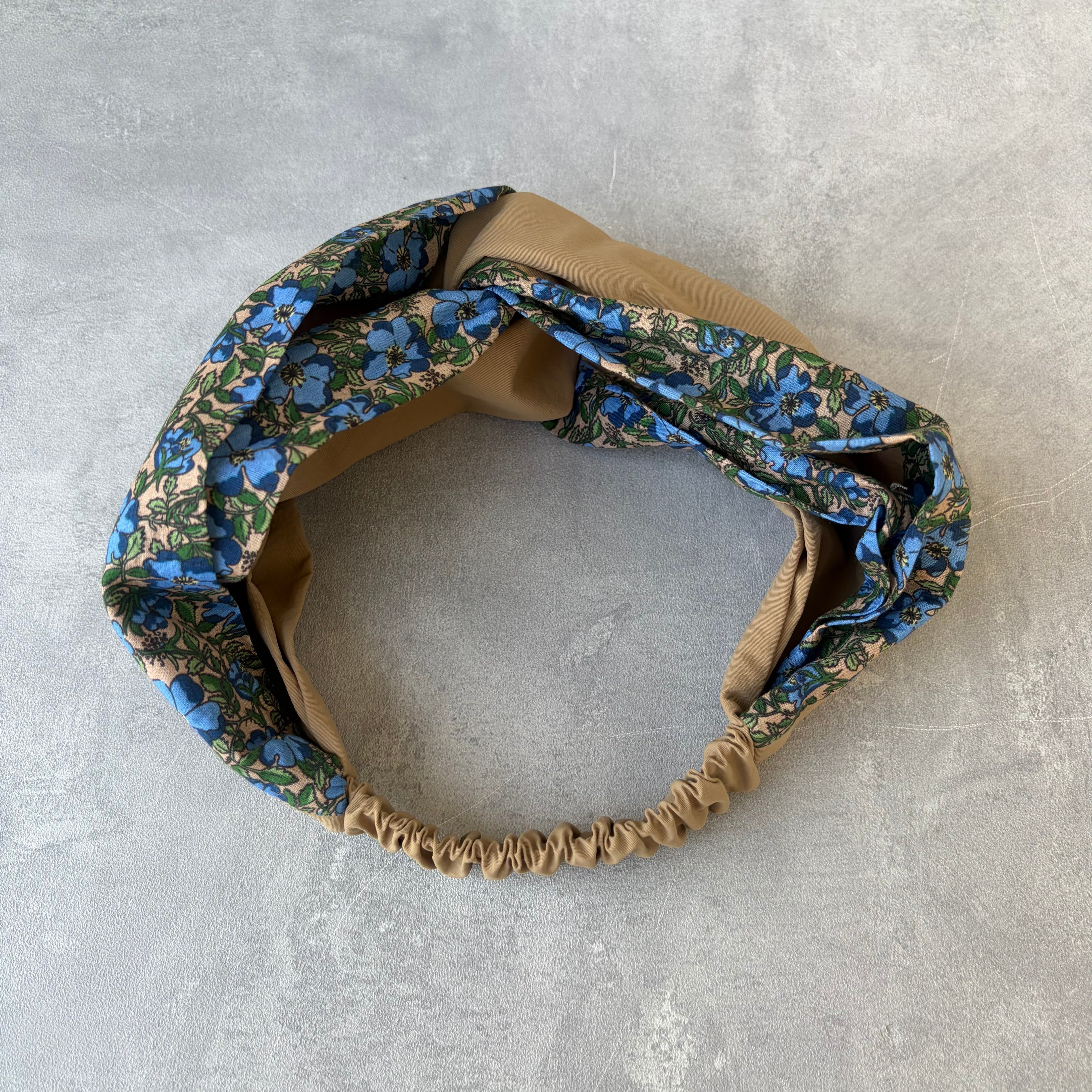 落ち着いたベージュにブルーの小花柄を組み合わせたターバン。