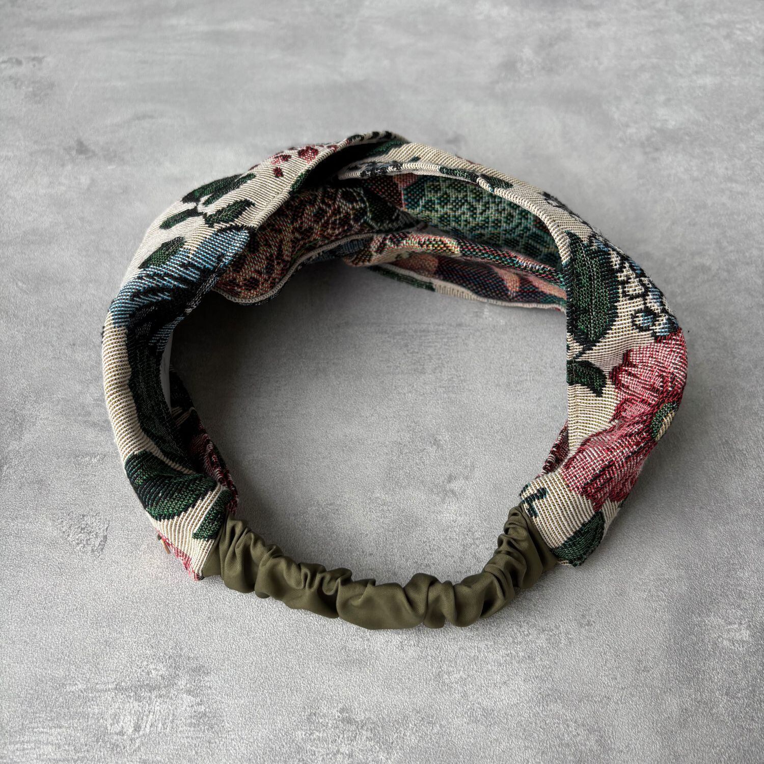 ゴブラン生地に、大きめの花柄をあしらった存在感のあるヘアターバン。