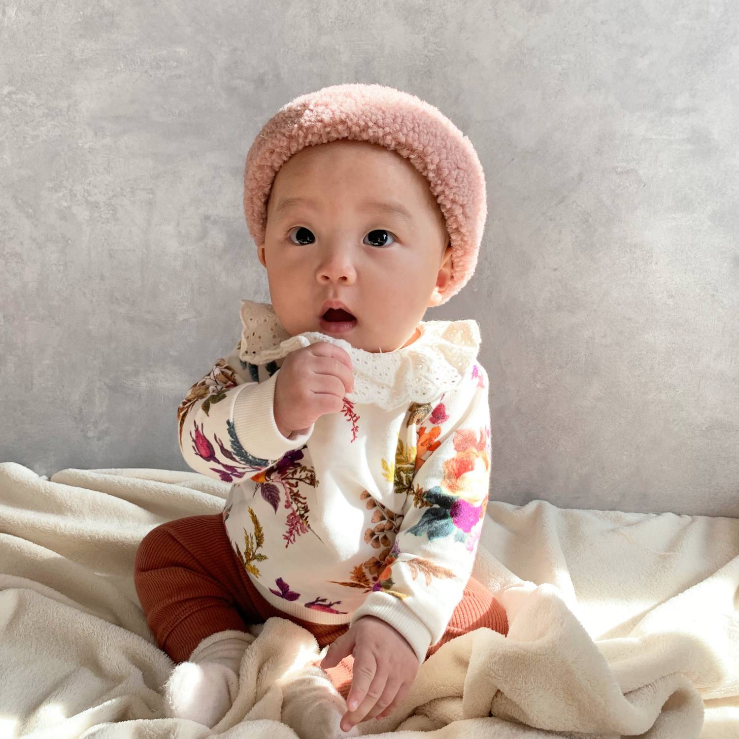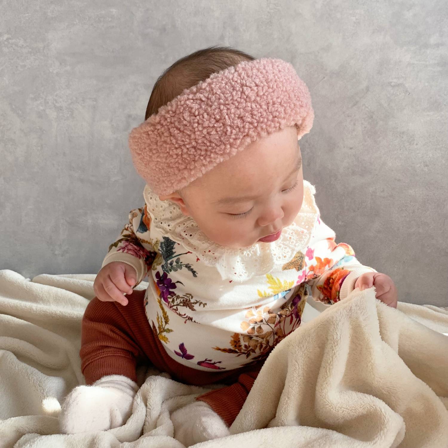 髪の生え具合で女の子に見えづらいベビーの時期も、ヘアターバンを付ければ女の子らしいスタイリングに。