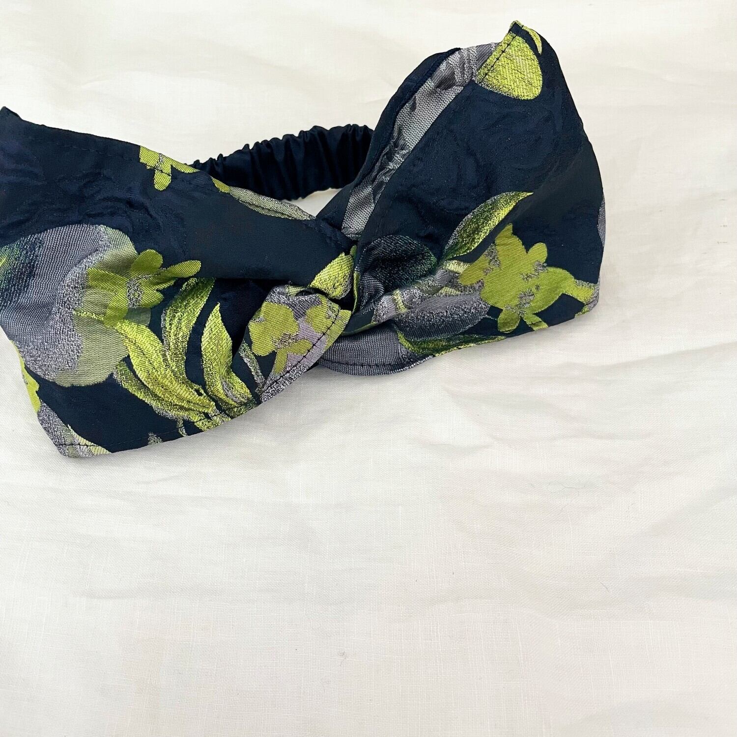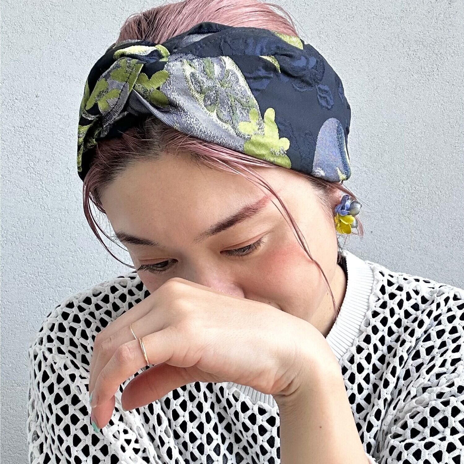 ライムグリーンが映えるヘアターバン。