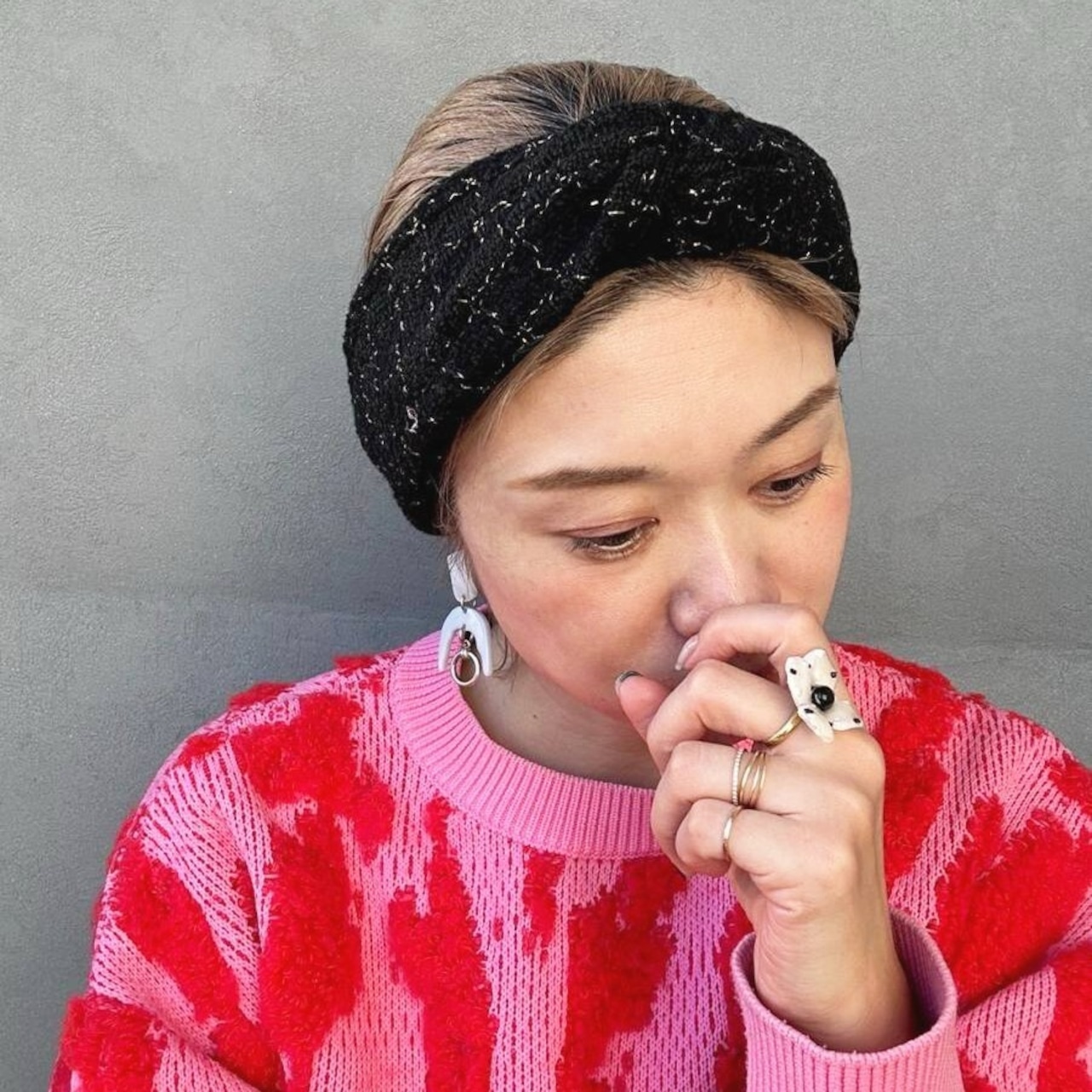 ブラックのツイード生地にゴールドの模様が入ったヘアターバン。